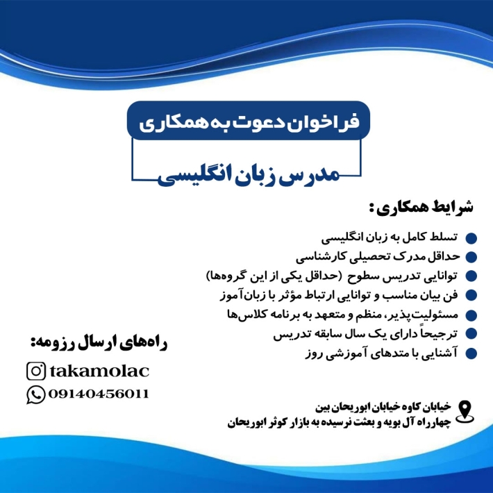 جهت تکمیل کادر آموزشی خود از مدرسین زبان انگلیسی (خانم) دعوت به همکاری مینماید