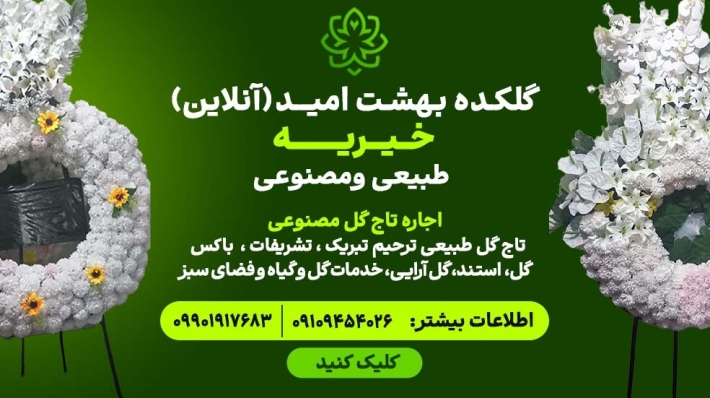 گلکده بهشت امید در طرحی نو و با فکر ایده های خلاقانه جهت مراسم های ترحیم ، عزا، شادی ، عقد ، عروسی ، تولد ، افتتاحیه گل و تاج گل استند ، تندیس ، لوح قاب عکس، گل برای روی قبور