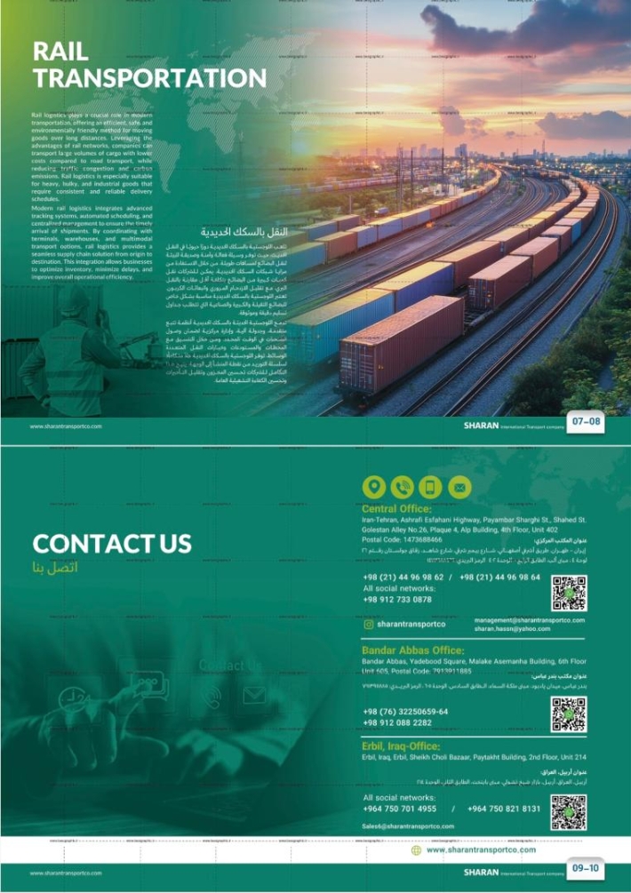 حمل محموله هایی نظیر گوشت – لاستیک – قطعات خودرو – کولر و .... از مبادی کشورهای اسیای شرقی به عراق و اذربایجان – ترکیه و کشورهای ترکمنستان / قزاقستان و تاجیکستان از تخصص این شرکت می باشد