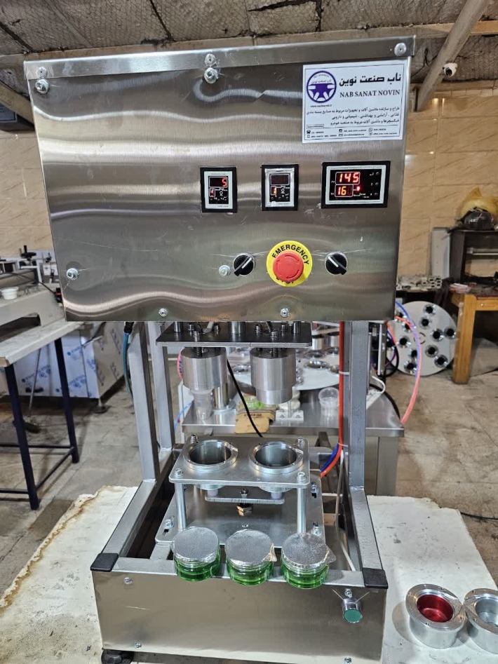 دستگاه با شرايط كاملا" بهداشتي و منطبق با بالا ترين استانداردهاي صنايع غذایی و دارویی می باشد. به طور استاندارد دارای 2.5 الی 3 متر کانوایر بوده و دستگاه دارای یک دست دایست طبق نمونه ظرف خریدار می باشد. عرض کانوایر قابلیت تنظیم برای چندین نمونه ظرف را دارا می باشد و دارای محرک با توان 0.37 کیلو وات می باشد. دستگاه داری جک جلوگیر و فیکس کننده ظروف در زیر دایست می باشد. ظروف بر روی کانوایر حرکت کرده و با تماس به میکروسوئیچ مخصوص ، توسط جلوگیر فیکس شده و در زیر دایست قرار میگیرد. دایست به صورت اتوماتیک به سمت پایین حرکت کرده و با برش فویل عمل سیل انجام می شود. داخل سمبه المنت حرارتی تعبیعه شده است که عملیات هات پلیت را انجام می دهد. ماشین دارای رول جمع کن اتوماتیک با محرک مستقل با توان 0.18 کیلو وات می باشد. درجه حرارت سمبه از طریق نمایشگر قابلیت تنظیم برای فویلها با ضخامت های مختلف را دارا می باشد. که از طریق ترموکوپل متصل به سنبه به نمایشگر منتقل می شود. دستگاه برای سطل ها با قطرها و ارتفاع های متفاوت ، سطل بزرگ ( قطر بیرون 250 میلیمتر ، ارتفاع 250 میلمتر ) سطل کوچک ( قطر بیرون 215 میلیمتر ، ارتفاع 200 میلمتر ) را با تنظیمات ساده قابلیت استفاده را دارد.