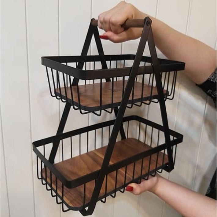 این ظرف پذیرایی دارای دو طبقه است که روی یکدیگر قرار گرفته اند و طبقات به وسیله ی پایه ای هشتی شکل به یکدیگر متصل شده اند. طبقه ی پایینی ابعاد بزرگتری نسبت به طبقه ی بالای آن دارد. کف طبقات چوبی به صورت یکدست قرار داده شده که علاوه بر زیبایی مانع از افتادن میوه و خوراکی ها از درون آن خواهد شد. اطراف آن نیز میله هایی از جنس فلز آبکاری شده با فاصله های یکسان قرار گرفته که از بیرون ریختن محتویات داخل ظرف جلوگیری می کند. بالای آن نیز دستگیره ای لوله ای شکل از چوب قرار گرفته که به وسیله ی آن می توانید سبد را به راحتی برای پذیرایی جابه جا کنید. به دلیل متفاوت بودن سایز طبقات و داشتن فاصله ی کافی از آنها دسترسی به میوه و خوراکی های چیده شده در طبقه ی پایین آن به راحتی امکانپذیر است. می توان از آن به عنوان استندی برای چیدمان وسایل دکوری، خوراکی های پراستفاده و به عنوان پاسماوری روی کابینت آشپزخانه استفاده نمود.
