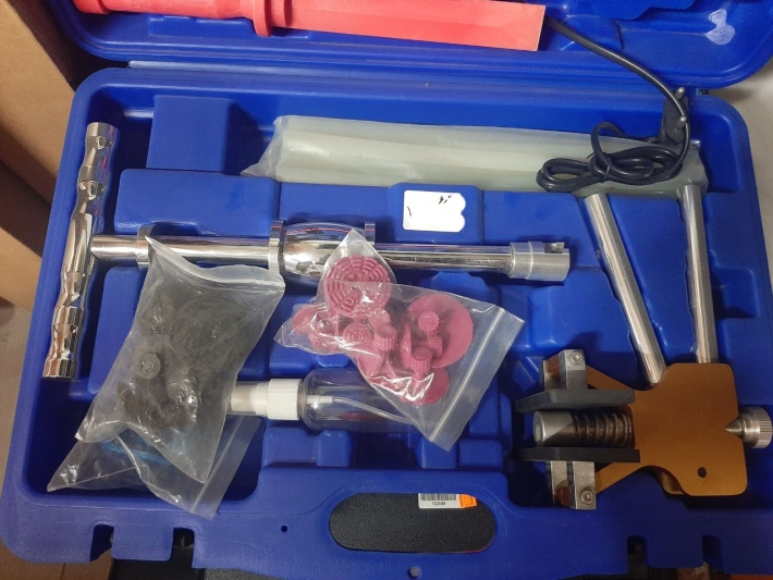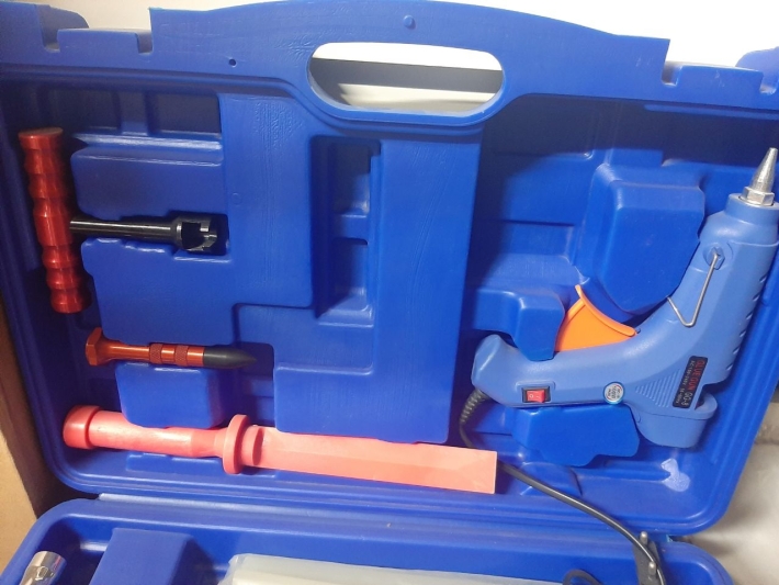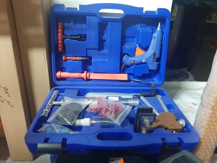 ابزار صافکاری بدون رنگ خودرو برند یورمو شامل انبر تگرگ کش صافکاری ضربه زن صافکاری تفنگ حرارتی به همراه چسب مخصوص 29 عدد یدکی تگرگ کش چسبی به همراه دسته مخصوص نیش زن صافکاری کاردک و ظرف اسپری