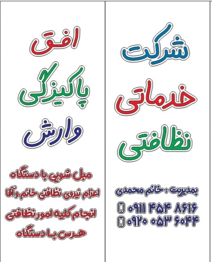 نظافت منازل، ادارات، شرکت‌ها، ساختمان‌ها، راه‌پله‌ها و پارکینگ‌ها با نیروهای خانم و آقا‌ی مجرب، خوش‌قول و مورد اعتماد.