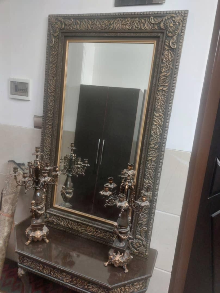 یک دست آینه و شمعدان چوبی برنزی بهمراه میز