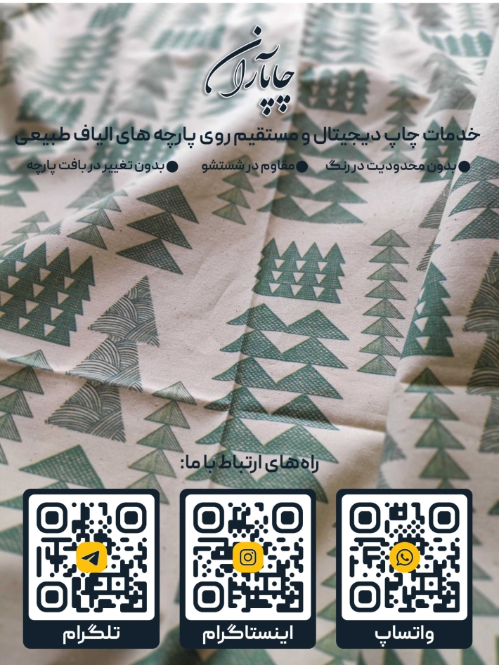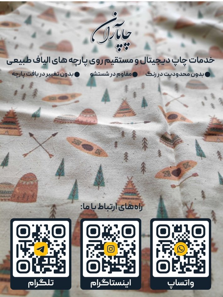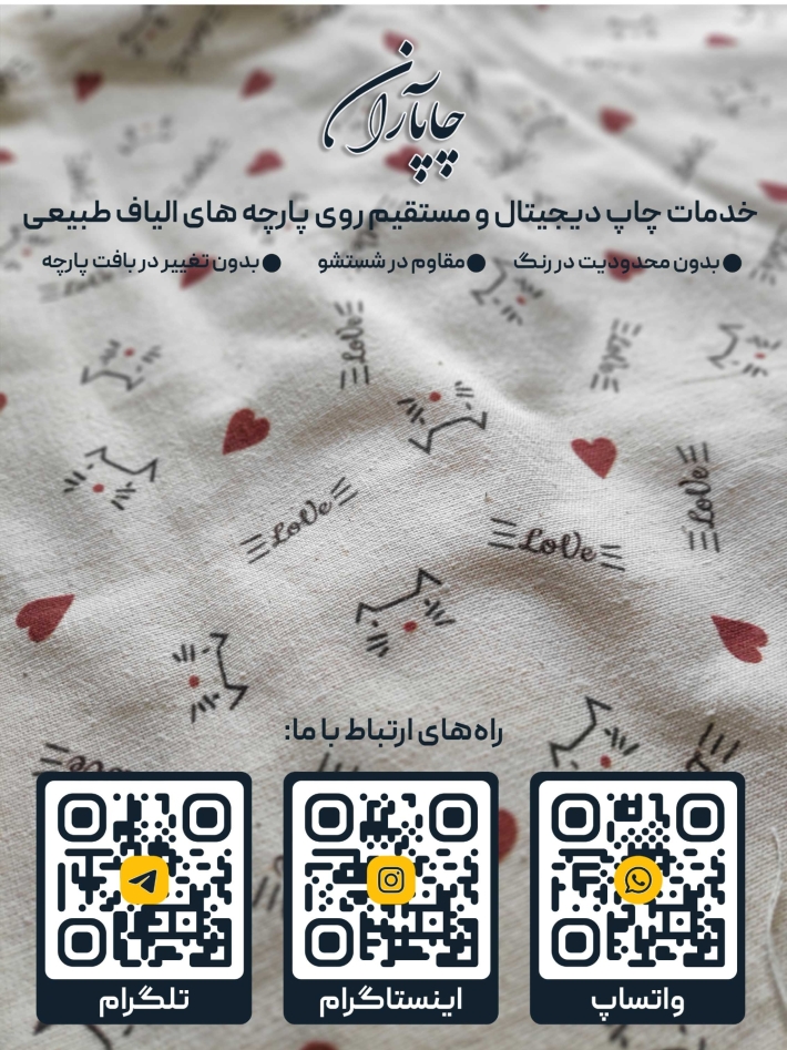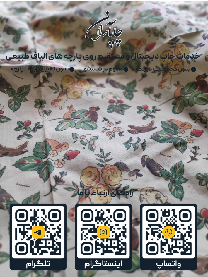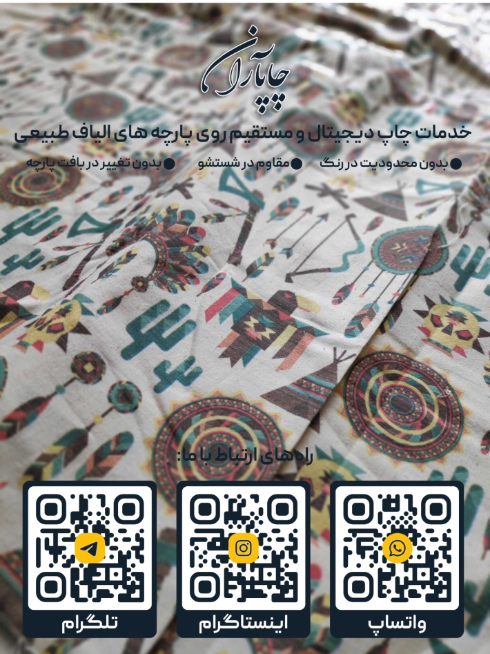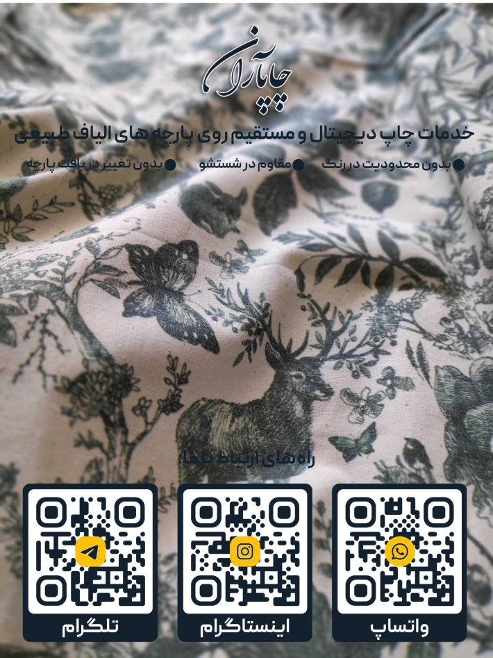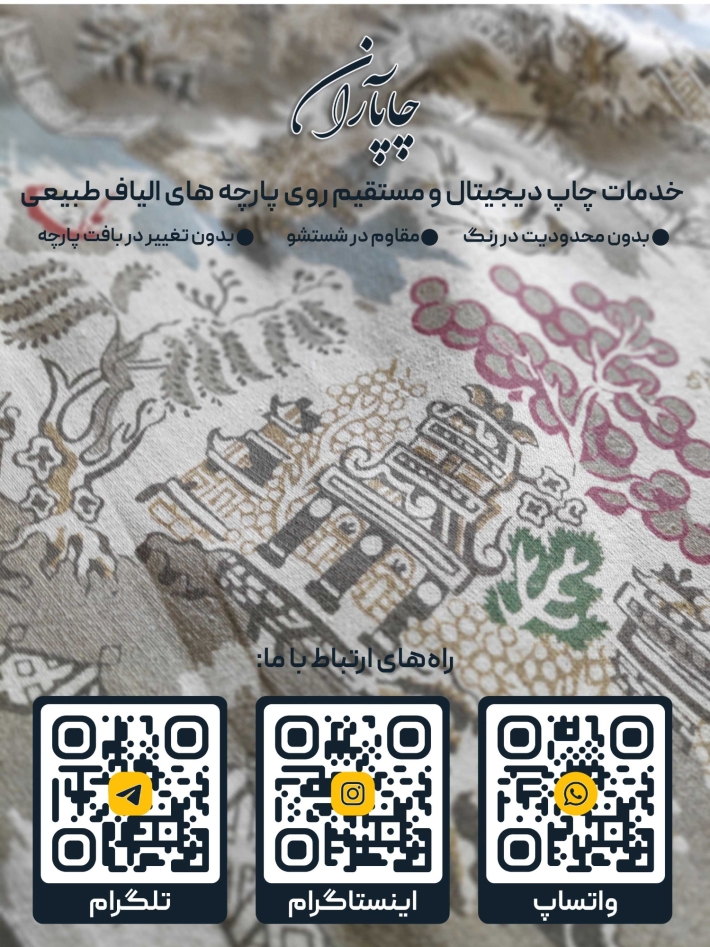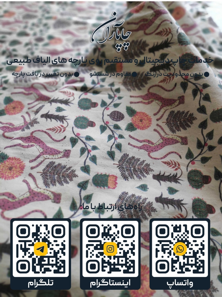 - چاپ دیجیتال روی پارچه‌های 100٪ طبیعی — بدون محدودیت در رنگ، با کیفیتی که هر پارچه‌فروشی یا تولیدی نیاز داره