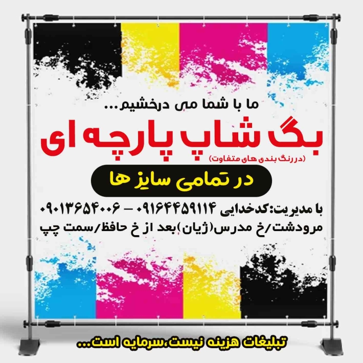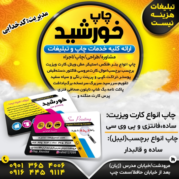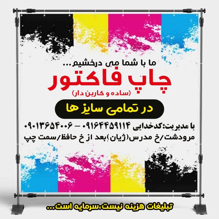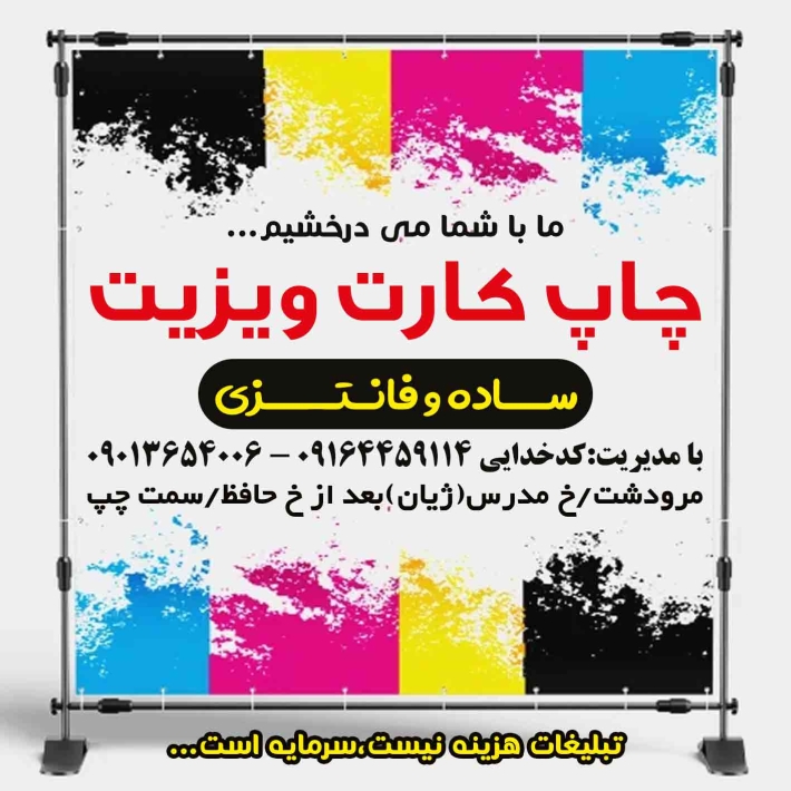 چاپ انواع بنر،فلکس،استیکر،مش،کارت ویزیت،فاکتور،دسته قبض،سربرگ،بروشور،پوستر،اعلامیه،پرس کارت،هدایای تبلیغاتی،لیوان،بگ شاپ پارچه ای،نایلون،تقویم،سررسید،جلد مدارک ،کارت عروسی،دفترچه یاداشت،پاکت نامه،قولنامه،برچسب،برچسب اموال،اسکن مدارک،چاپ و رایت سی دی،صحافی فنری و ...