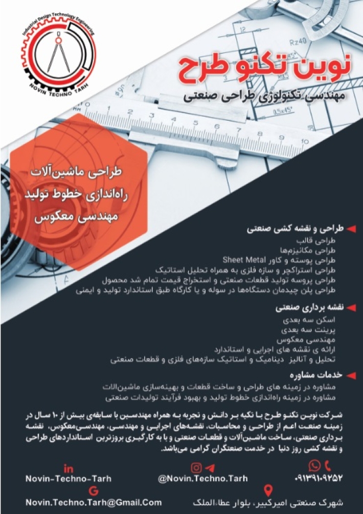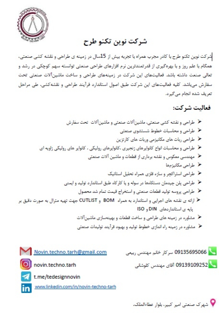 شرکت نوین تکنو طرح با کادر مجرب همراه با تجربه بیش از 15سال در زمینه ی طراحی و نقشه کشی صنعتی، همگام با علم روز و با بهره¬گیری از قدرتمندترین نرم افزارهای طراحی صنعتی توانسته سهم کوچکی در رشد و تعالی صنعت داشته باشد. فعالیت¬های این شرکت در زمینه¬های طراحی و ساخت ماشین-آلات صنعتی تحت سفارش می¬باشد. کلیه فعالیت¬های این شرکت طبق اصول استاندارد فرآیند طراحی و نقشه¬کشی، طی مراحل تعریف شده انجام می¬گیرد.