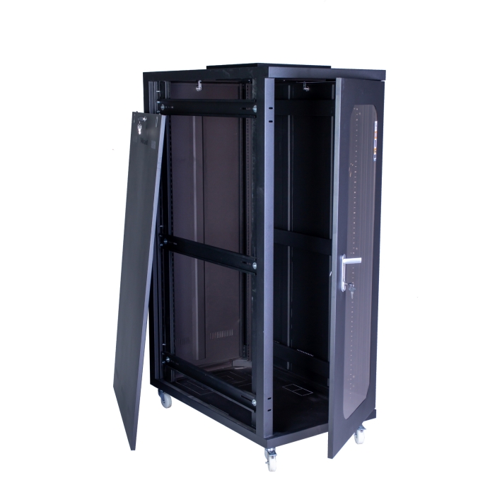 رک مدل KS22100DF در عمق100 سانتیمتر و ارتفاع 22 یونیت و در استاندارد 19 اینچ و با بدنه ی مقاوم از جنس فلز و رنگ الکترواستاتیک مشکی ضدخش تولید شده است و نیز دارای درب جلو شیشه ای با فریم فلزی با قفل ریتال و درب های جانبی و پشت بصورت بازشو همراه با قفل سوییچی و نیز از ورودی و خروجی کابل از بالا به پایین بهره می برد ،قابل ذکر می باشد که رک ایستاده 22 یونیت با عمق 100 قابلیت نصب 3 عدد فن اضافه، پایه تنظیم و درب توری در جلو و عقب رک جهت اتاق سرور و تهویه هوای بهتر را دارا می باشد.